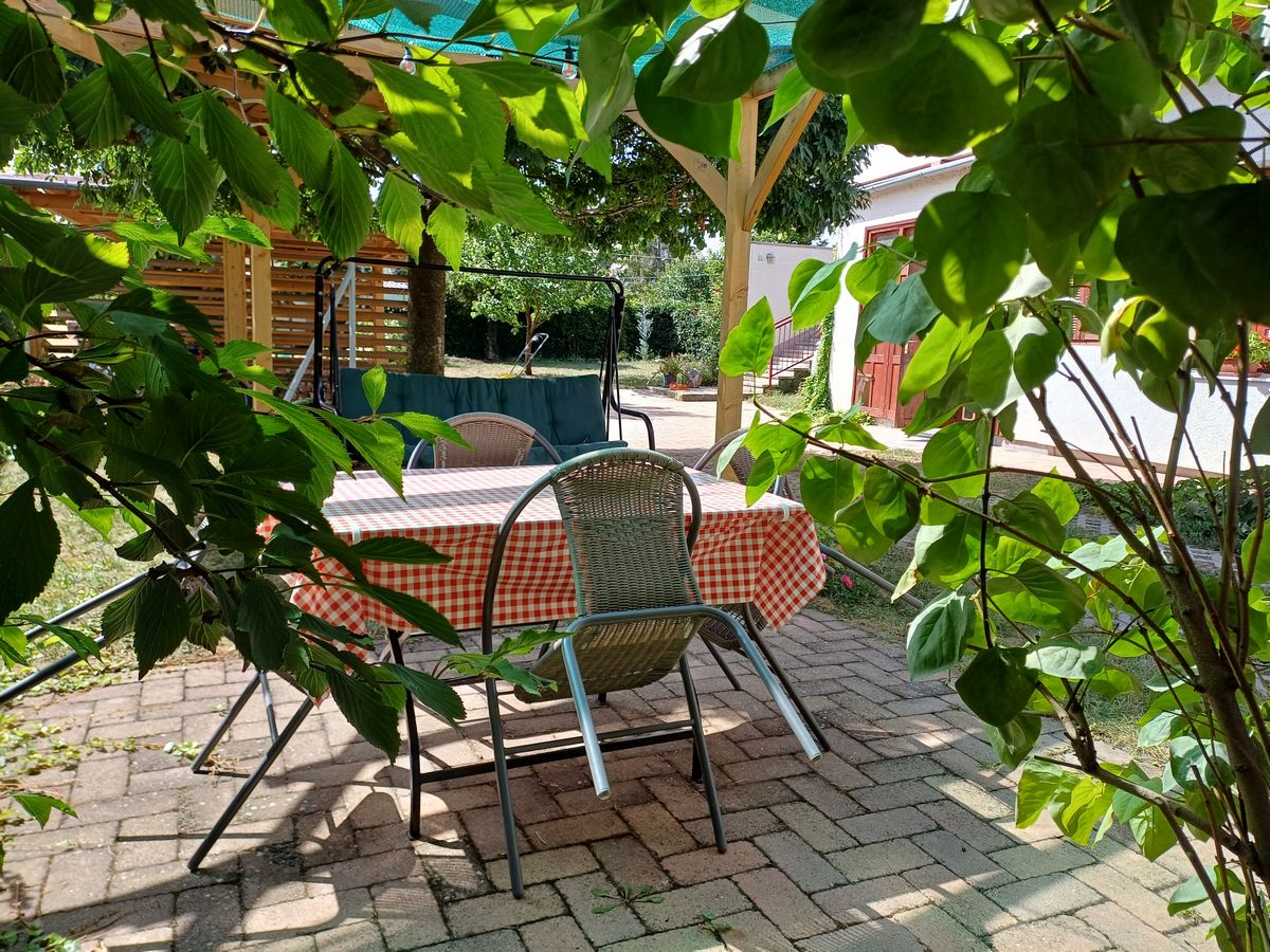 A házhoz tartozó gondozott kert a balatoni nyár esszenciáját kínálja. A fák árnyékában kényelmes kerti kiülők, napozóágyak és hintaágy várja, hogy átadjátok magatokat a pihenésnek, de egy hangulatos esti grillezéshez is tökéletes helyszín. A csendes környezetben jókat beszélgethettek egy pohár bor mellett, miközben hallgatjátok a szöcskék ciripelését.